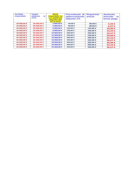 Se supponiamo un reddito imponibile di 50.000 euro il beneficio, come riportato in tabella, si applica sulla differenza di reddito tra i 50.000 e i 28.000 euro, ovvero su una base imponibile di 22.000 euro. Il risparmio annuo massimo è il seguente: 22.000×2%=440 euro, poco più di 36 euro al mese per redditi da 50.000 euro! Per quelli che hanno un reddito imponibile di 30.000 euro il beneficio fiscale, come riportato in tabella, è di poco più di 3 euro mensili.